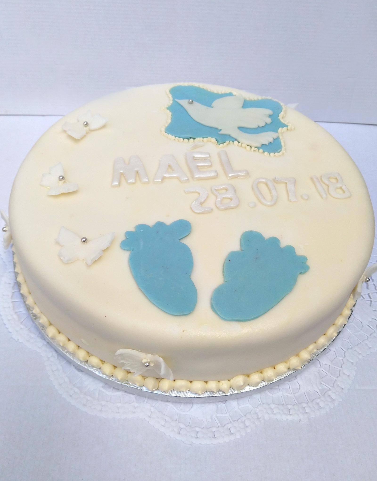 Weißgedeckte Tauftorte mit hellblauen Marzipanfüßen, einer Friedenstaube und weißen Schmetterlingen.