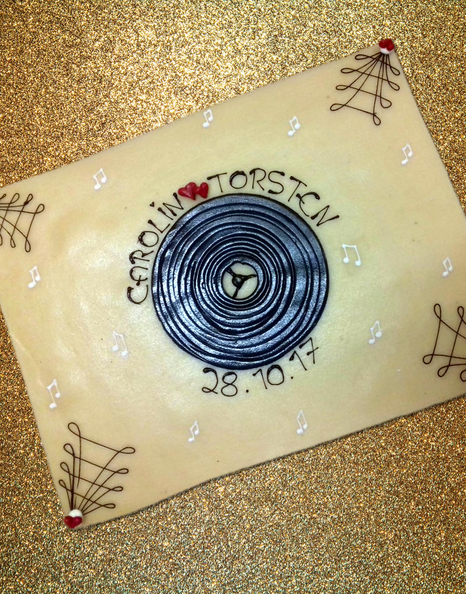 Eckige Hochzeitstorte in schwarz-weiß mit schwarzer Schallplatte aus Marzipan und weißen Zucker-Noten.